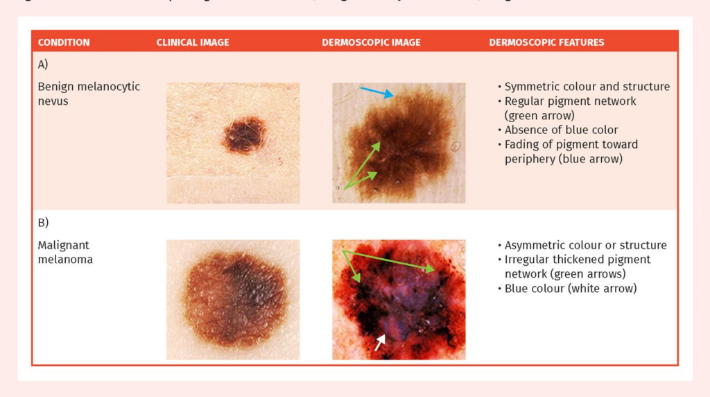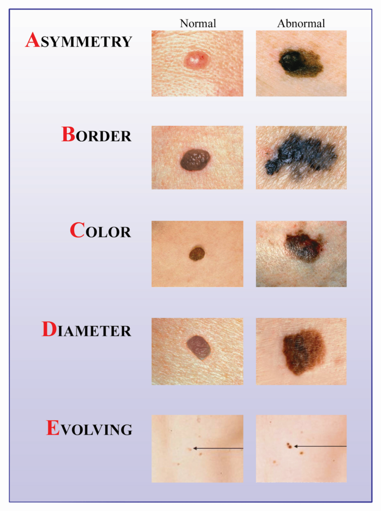 Melanoma can look like a changing mole or a new “different” spot. Dermatologists often teach the ABCDE rule: