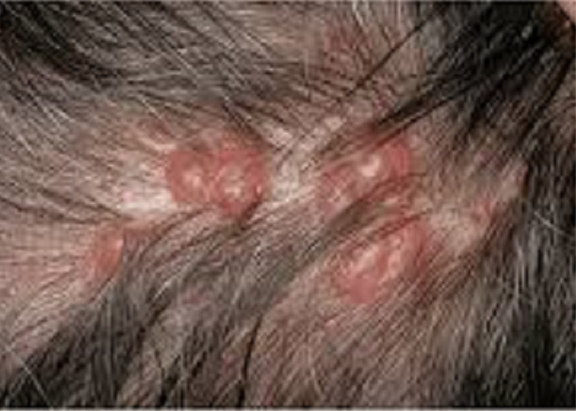 Often on scalp/forehead or upper trunk