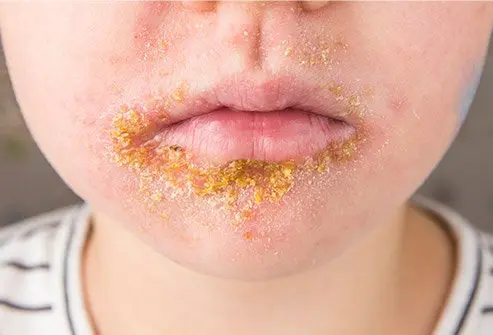 • Red sores that form honey-colored crusts